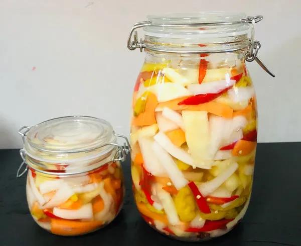 4.酸辣可口,清爽開胃的蘿卜泡菜就做好了,放入玻璃器皿中,放冰箱冷藏,第二天就可以開吃啦。