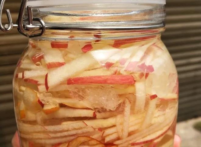 5.瓶口封上保鮮膜,蓋上蓋子,在較溫暖處呆上三個(gè)月以上,那時(shí)蘋果全部呈黃褐色且干枯狀浮于醋中,而醋卻呈現(xiàn)清亮的金黃色時(shí),即可開蓋享用。